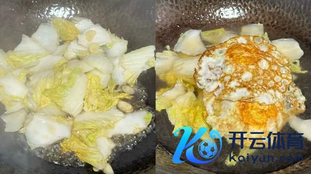 2、加入一勺海盐,把白菜炒至变软,加入一勺生抽翻炒,然后加入一碗滚水,再把鸡蛋加进去;