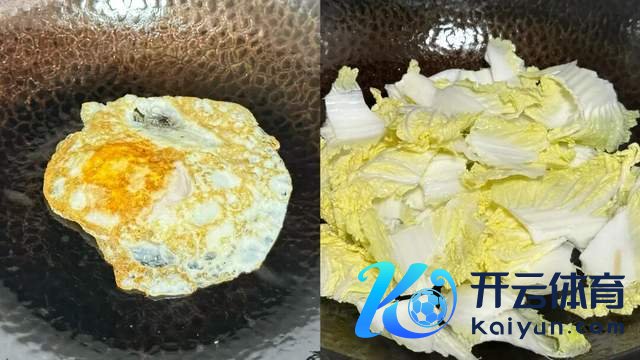 1、先来把鸡蛋煎一煎,铁锅烧热,加点油,再磕入鸡蛋,等鸡蛋定型之后再翻面,煎至两面金黄色就行,铁锅煎蛋一定要把锅烧热再倒油,这样不会粘锅;把鸡蛋盛出来,另起锅加入极少植物油,加入蒜片炒香,再下入白菜翻炒;